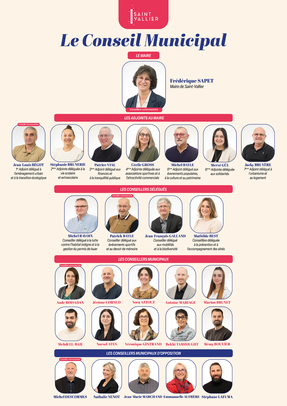Le Conseil Municipal de Saint-Vallier a été élu en Mars 2026. Il est composé de 27 membres dont le Maire.